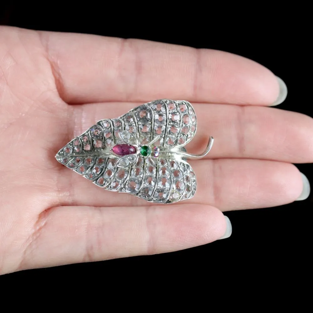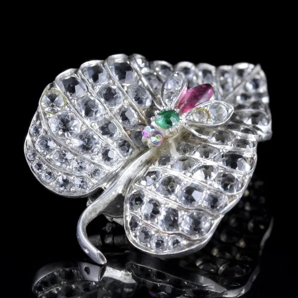 The brooch depicts a beautiful Leaf adorned with sparkling white Paste Stones with a colourful Paste Fly in the centre.